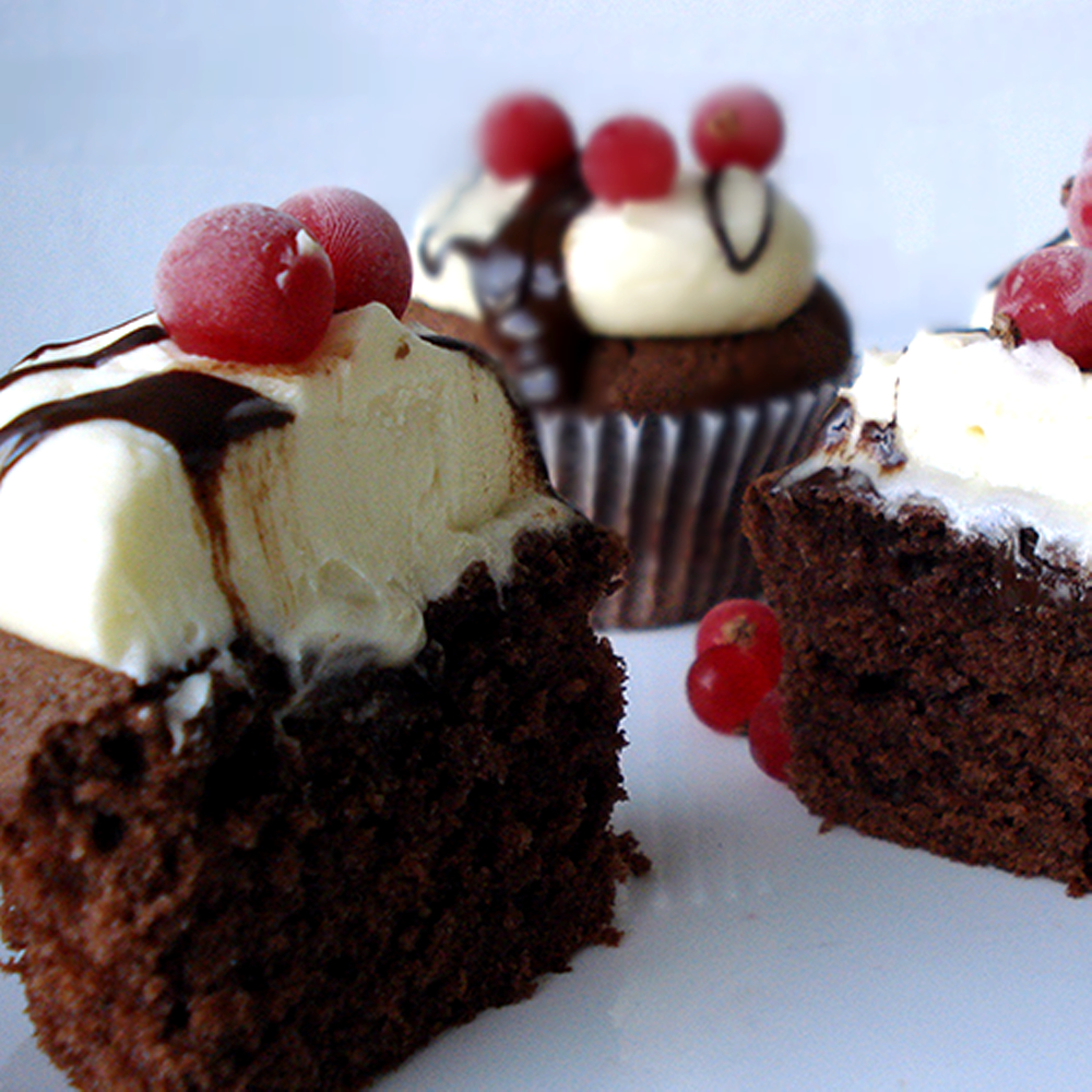 Maak het basisrecept cupcakes recept. Voeg als laatste de cacaopoeder toe en spatel dit rustig door het beslag. Wanneer je de papieren bakvormpjes hebt gevuld, duw je in elk bakvormpje een stukje chocolade in het beslag. Je mag het stukje chocolade nog net in het beslag zien zitten.